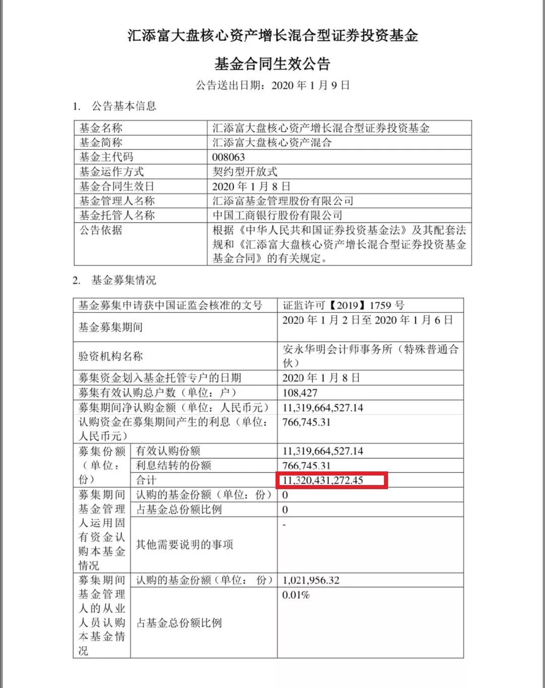 1月2日开始发售,原定于1月17日结束募集的汇添富大盘核心资产混合基金,1月6日就提前结束募集。今日,汇添富基金发布汇添富大盘核心资产混合基金基金合同生效公告,短短3个工作日,基金大卖113.20亿元,认购户数突破10万户,成为今年首只百亿规模新基金。