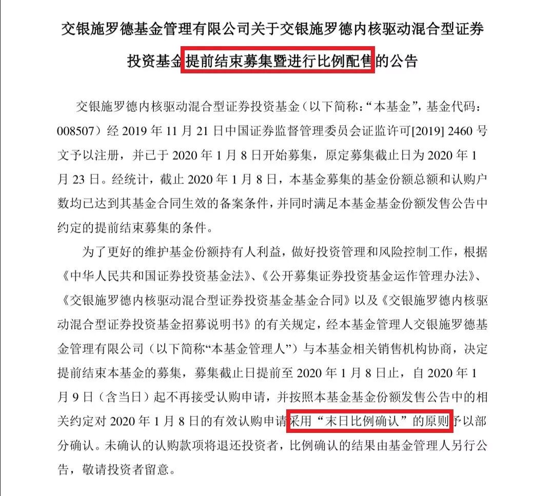 公告中称,交银内核驱动混合募集截止日提前至 2020 年 1 月 8 日止,自 2020 年 1月 9 日(含当日)起不再接受认购申请,并按照基金份额发售公告中的相关约定对 2020 年 1 月 8 日的有效认购申请采用“末日比例确认”的原则予以部分确认。